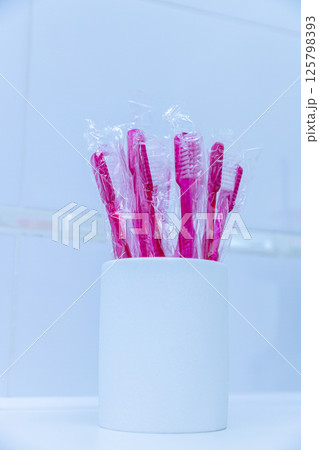 A Collection of Bright Pink Toothbrushes in a White Holder, Perfectly Arranged for Oral Care with a Clean and Modern Aesthetic