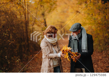 Senior man and woman enjoying a walk in fall, throwing fallen leaves.