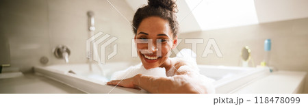 The woman is happily bathing in a jacuzzi tub, smiling with joy