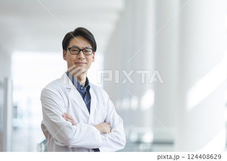 カメラ目線で腕組みをする白衣を着た40代の男性