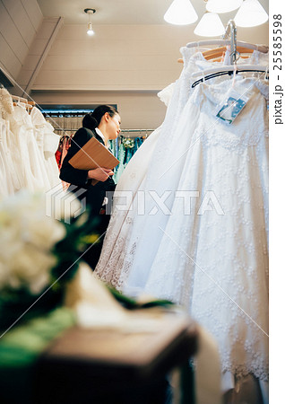 結婚式の準備でウェディングドレスの衣装合わせをするアジア人女性(試着・フィッティング)