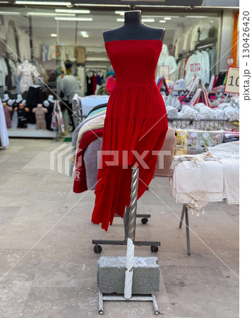 Red strapless dress on mannequin in a street market. Fashion, style, and seasonal clothing for women.
