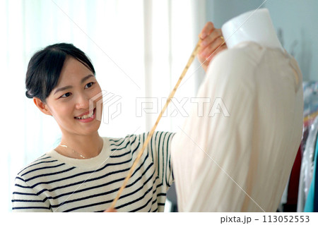 Happy beautiful Asian young woman working in the fashion design studio, professional female fashion designer portrait in design studio.