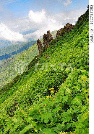 北海道 大雪山縦走 黒岳から層雲峡温泉に下る縦走路に咲くチシマキンバイソウ