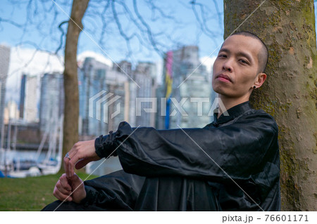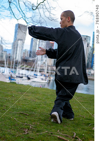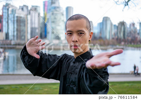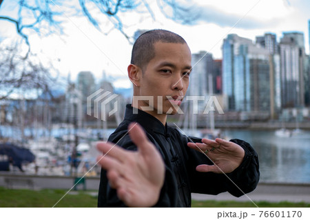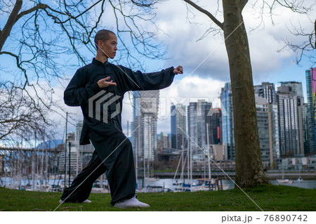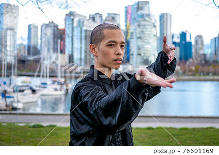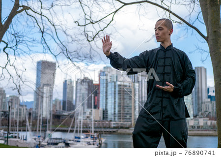 公園で太極拳を舞う中国人男性(全身・縦写真)