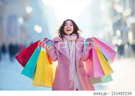 冬のショッピングを楽しむ笑顔の女性|カラフルな紙袋と光に包まれた華やかな街中で