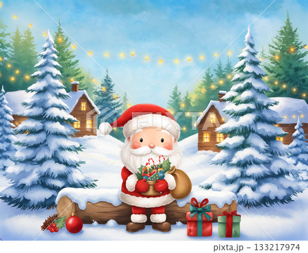 プレゼントの袋を持ったシックなサンタクロース 水彩タッチ