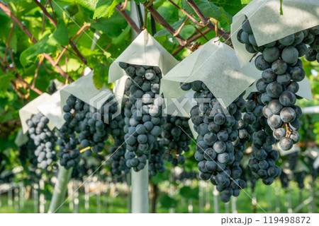 ぶどう畑,ぶどうの袋がけをする農家の男性