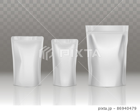 Realistic vector mock up plastic Black and white Food Stand Up Flexible Pouch Sachet set.