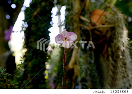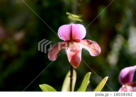 紫色の洋蘭、パフィオペディルムが咲いています。学名:Paphiopedilum