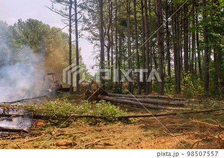 Burning uprooted forest on construction site for construction to build houses is taking place