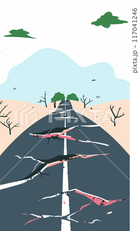 Desert road stretching into horizon cracks damage, abstract minimalist art style. Vector graphic depicts damaged asphalt pavement abstract design, pastel colors, surreal landscape. Dry barren land