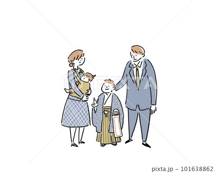 七五三、羽織袴を着た男の子と両親と赤ちゃん、(文字なし)