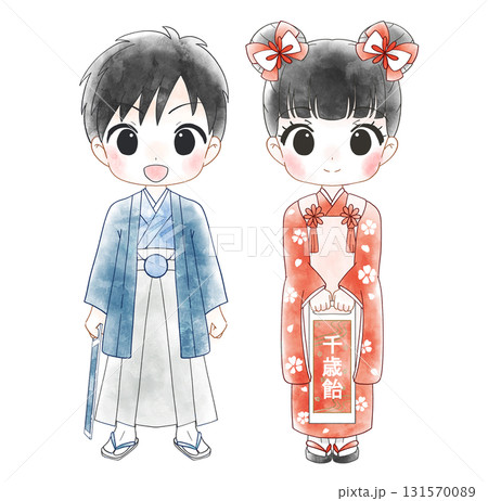 七五三のかわいい男の子と女の子の水彩風イラスト