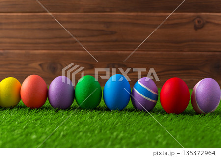 Colorful eggs lined up on green grass with a wooden background during spring season