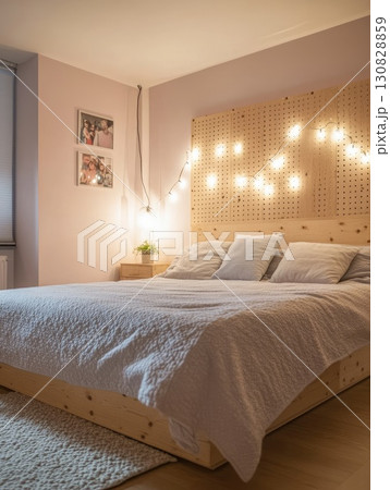 Cozy Bedroom Interior With Wooden Bed Headboard And String Lights Illuminating Soft Pillows And Comfy Bedding