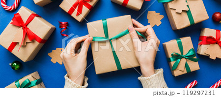 Woman is packing surprise gift for Christmas holidays, sitting at workplace with craft tools, top view. Woman wrapping Christmas gift at colored table