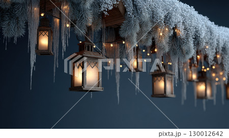 Snow covered pine branches adorned with glowing lanterns and icicles create serene winter scene