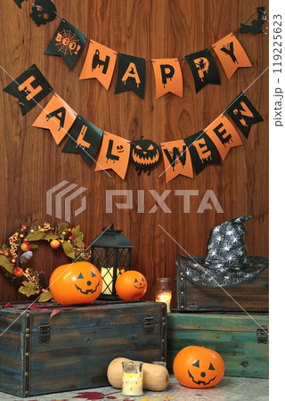 Halloween pumpkins on the autumn street. Holidays, decoration concept.