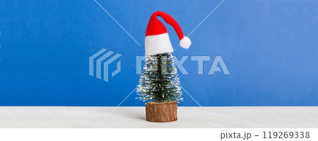 One small Christmas tree with santa hat on colored background. new year decoration with copy space
