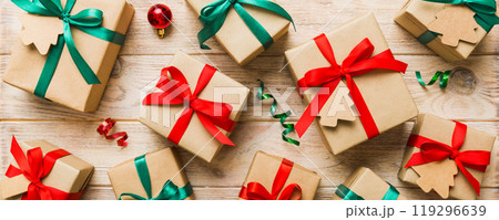 Christmas gifts and decorations with brown card and copy space on wooden background