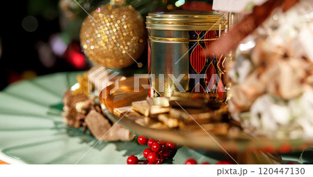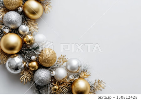 Delicate wreath of golden Christmas decorations hangs on the white wall. Magic and joy festive celebrations during the winter season. Elegant gold and silver Ornaments beautifully decorated setting.
