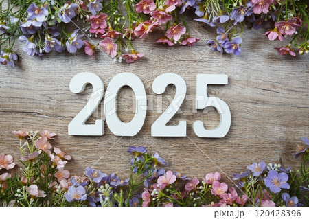 2025 years number with flowers frame top view on wooden background. Hello, Welcome and Goodbye new year concept