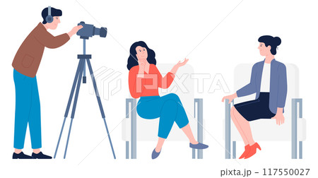 Interview studio. Operator with video camera shooting women talking