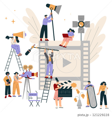 Vector illustration of video production. People create a movie and shoot a video. The work of the operator and the screenwriter