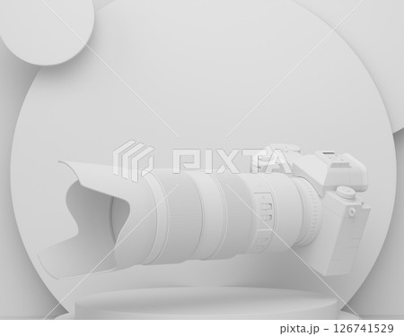 Abstract scene or podium with nonexistent DSLR camera and lens on monochrome