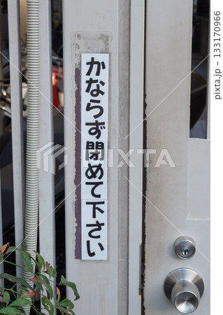 通用門に貼られた「からなず閉めて下さい」のステッカー