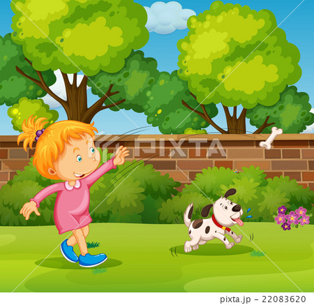 Girl playing with pet dog in the yard