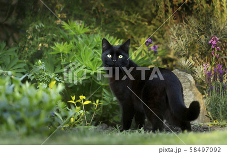 Black cat on the grass in the garden