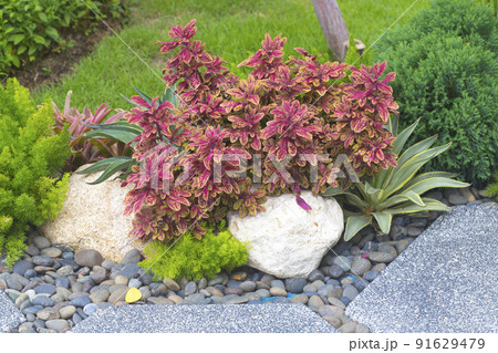 Landscape design in home garden, landscaping with flowers, plants and stones in summer. Landscaped backyard of residential house.