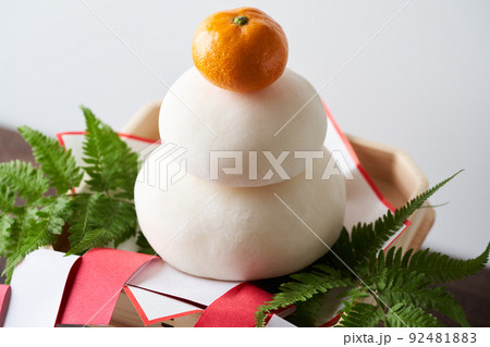 “鏡餅"を中央に配置した写真 白背景 三宝(台座)あり