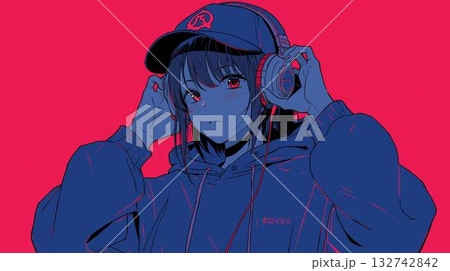キャップとヘッドホンの音楽を楽しむ女性イラスト