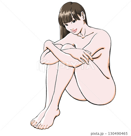 微笑を浮かべた体育座りの若い女性_裸_ロングヘア