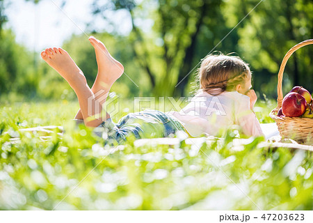 Childrens feet on grass in summer park
