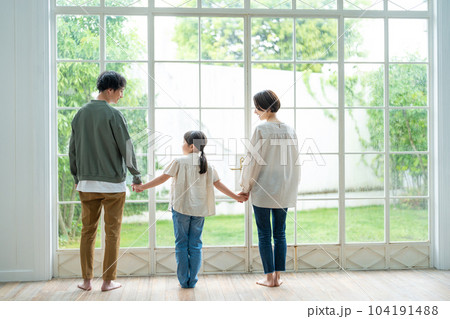 手をつないでだ家族の後ろ姿