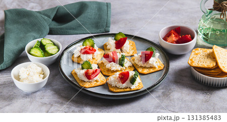 Appetizer of crackers with ricotta, cucumber and tomato on a plate on a table web banner