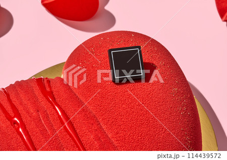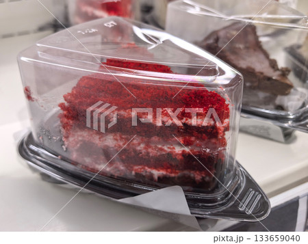 Rich red velvet cake displayed in a plastic container at a dessert shop