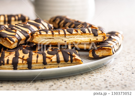 Sfogliatine glassate with chocolate. Italian crispy dessert on plate on kitchen table.