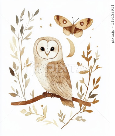Whimsical Watercolor Illustration of Owl Moth and Moon for Nature and Fantasy Designs Generative AI