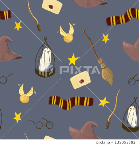 Seamless illustrated pattern with owls, flying brooms, scarves, stars and witch hats. Flat illustration designed for fabric printing, sewing projects, kids clothing, quilting, accessories and crafts.