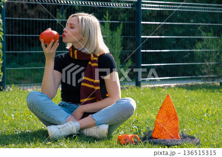 A beautiful girl is sitting on the terrace with a dog, holding a pumpkin in her hand.