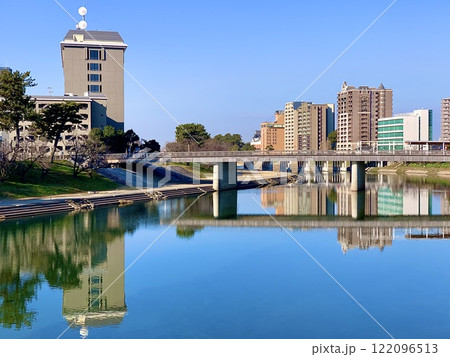 青空に映える水辺の街並み(西三河総合庁舎・桜城橋・乙川河川敷)〈愛知県岡崎市〉