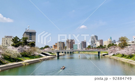 満開の桜並木・ボートの花見客・愛知県西三河総合庁舎・殿橋(乙川/愛知県岡崎市)