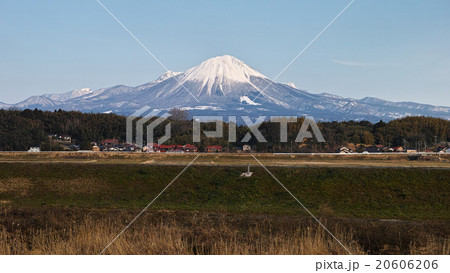 早春の快晴の青空をバックに北海道森町駒ヶ岳の西側斜面の雪山の風景を撮影