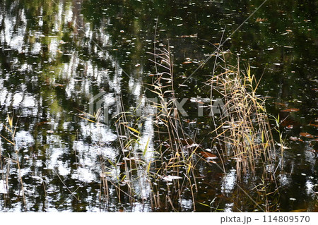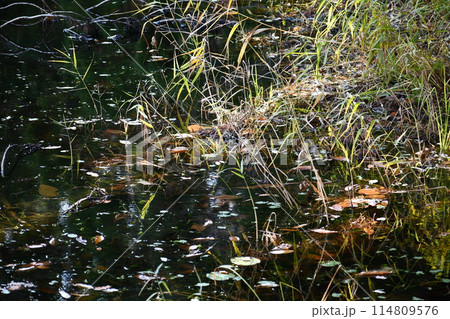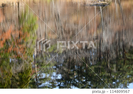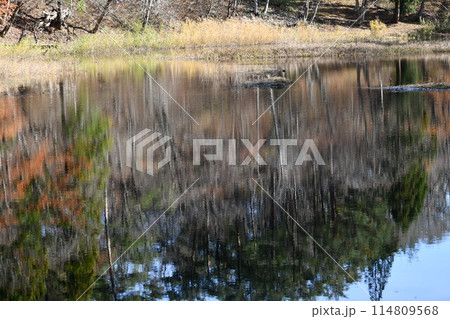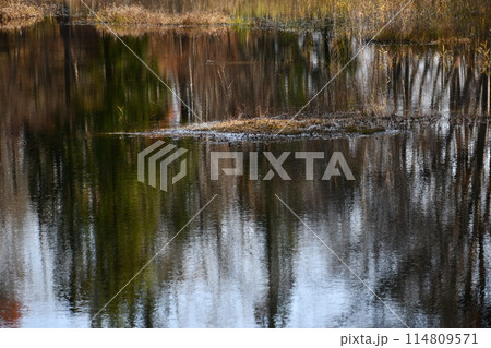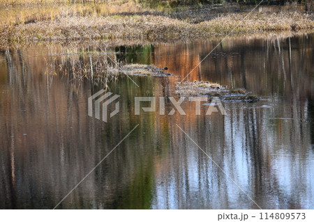 岸の近くの水面が反射している秋の風景が映っている西向沼