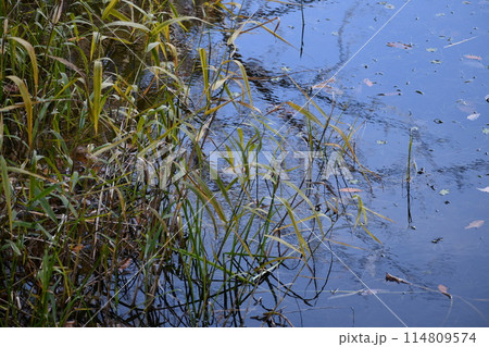 落ち葉が落ちている西向沼の水辺の近くの風景